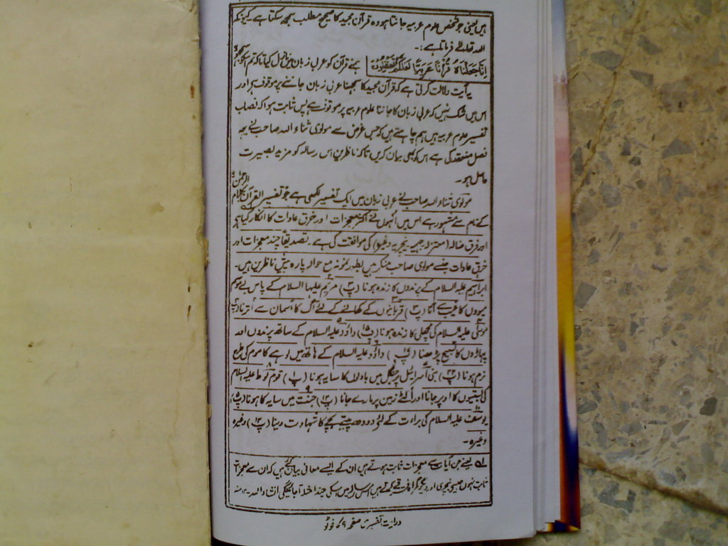 “ Mawlana Thanaullah has written a tafsir with name “ tafsir al quran bi qalamir rehman”. In this he has denied most of the muajizat ( miracles perfomed by prophets) and Khirqe addat ( things against normal customary things). He has followed the wrong sects like Mutazila, Jahmiya, Naturist etc .I present some instances where he has denied Miracles .
